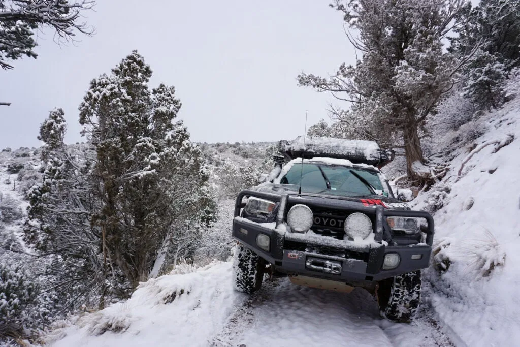 The tires were mounted on AEV Crestone wheels which have an optional beadlock. We didn’t use the beadlock attachment, but when used, it allows the tires to be aired down to single-digit pressures. This gives them more grip in loose terrain and over large obstacles. OK4WD installed an ARB air compressor under the hood to air tires back up to highway pressures or fill a flat. They also installed an air-locker in the front and rear differentials. When engaged, air lockers disengage the limited-slip differential and force all four tires to move. We used this feature once to clear a tree stump, and it felt like the truck was being pulled on a winch. In case we got stuck in a situation the lockers couldn’t get us out of, we had a set of MAXTRAX traction boards, a winch, and a recovery kit.