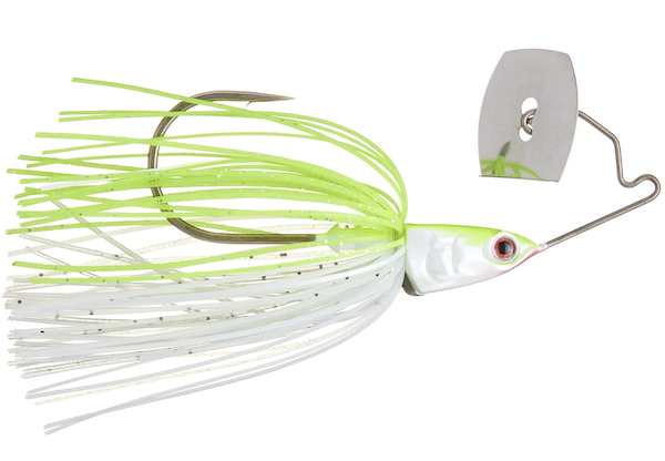 The Bass Puzzle Grass Piece combines elements of a spinnerbait with those of a vibrating jig. With a shorter, stiffer spinnerbait arm attached to a ChatterBait-esque blade, this lure has a rocking and rumbling action. The lure comes through grass and wood well, and the resistance of the bait’s hard thumping blade forces you to fish slowly. If you try to reel it in too fast, it will ride up and break the surface. Since this bait makes you fish slowly, it’s a great option in low-visibility situations. I’ve caught a few good fish on it in muddy and cold water, and I’m excited to fish this bait through the spring.