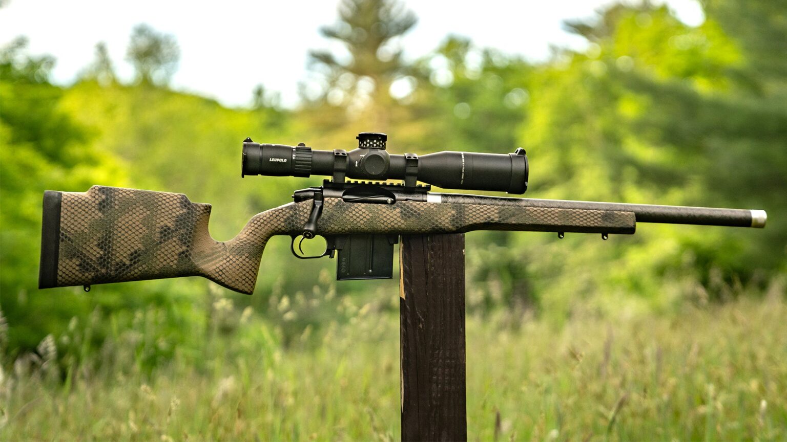 The barreled action is housed in a tastefully camouflaged and textured Proof Research carbon-fiber stock, and the rifle feeds from a detachable 10-round MDT magazine. But since the action has a Remington 700 footprint, and since the stock has the M5 cutout for bottom metal, it is also compatible with a Hunter detachable box magazine. The barrel is fully free-floated, and the stock is stiff enough to prevent forend-to-barrel contact if you sling up tightly. The stock’s comb is not adjustable but was high enough to work reasonably well with a 44mm objective riflescope in medium rings, and there’s a notch in the nose of the stock’s comb to allow for bolt removal. The recoil lug is bedded and the action rests in the stock on two pillars and slightly raised rails/guides on each side of the forward action screw to sort of provide a V-block nest for the action to nestle in. The rifle comes apart and goes together effortlessly and very precisely. All in all, it is a smartly designed and extremely well-built rifle.