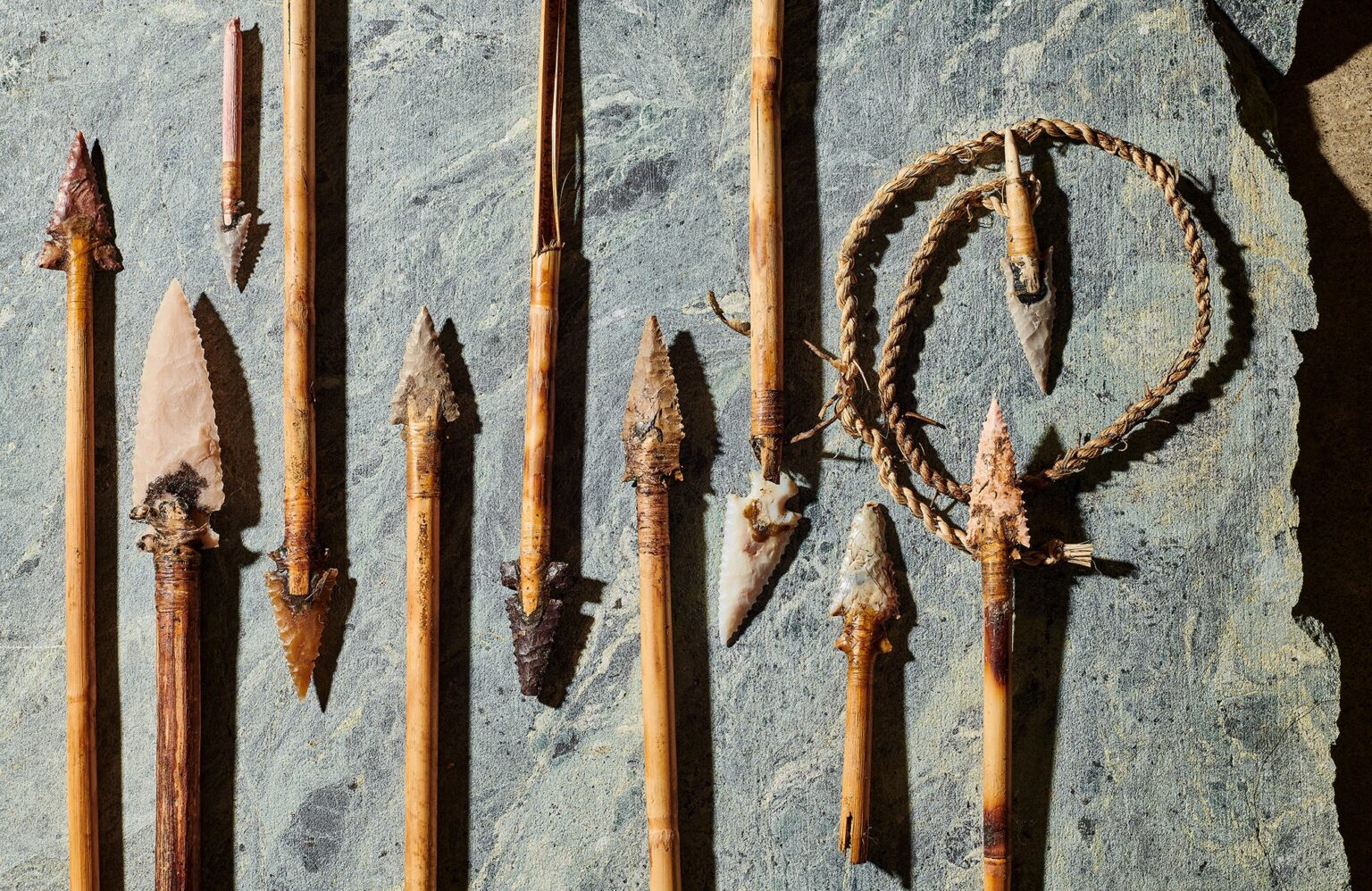 Gill used this harpoon point to spear a Florida alligator in 2019, after paddling a canoe to within 8 yards of the animal. “Primitive alligator hunters used canoes because they’re so quiet,” says Gill, “and the gator doesn’t really see it as a threat until it’s too late.” The stone point was initially attached to a spear. Once a gator is harpooned, the point stays in the animal but rotates and slips off the shaft, leaving the cordage for the hunter to hang on to. “I hit the gator in the lungs, and it sank to the bottom. Then I used the cord to pull him up.”