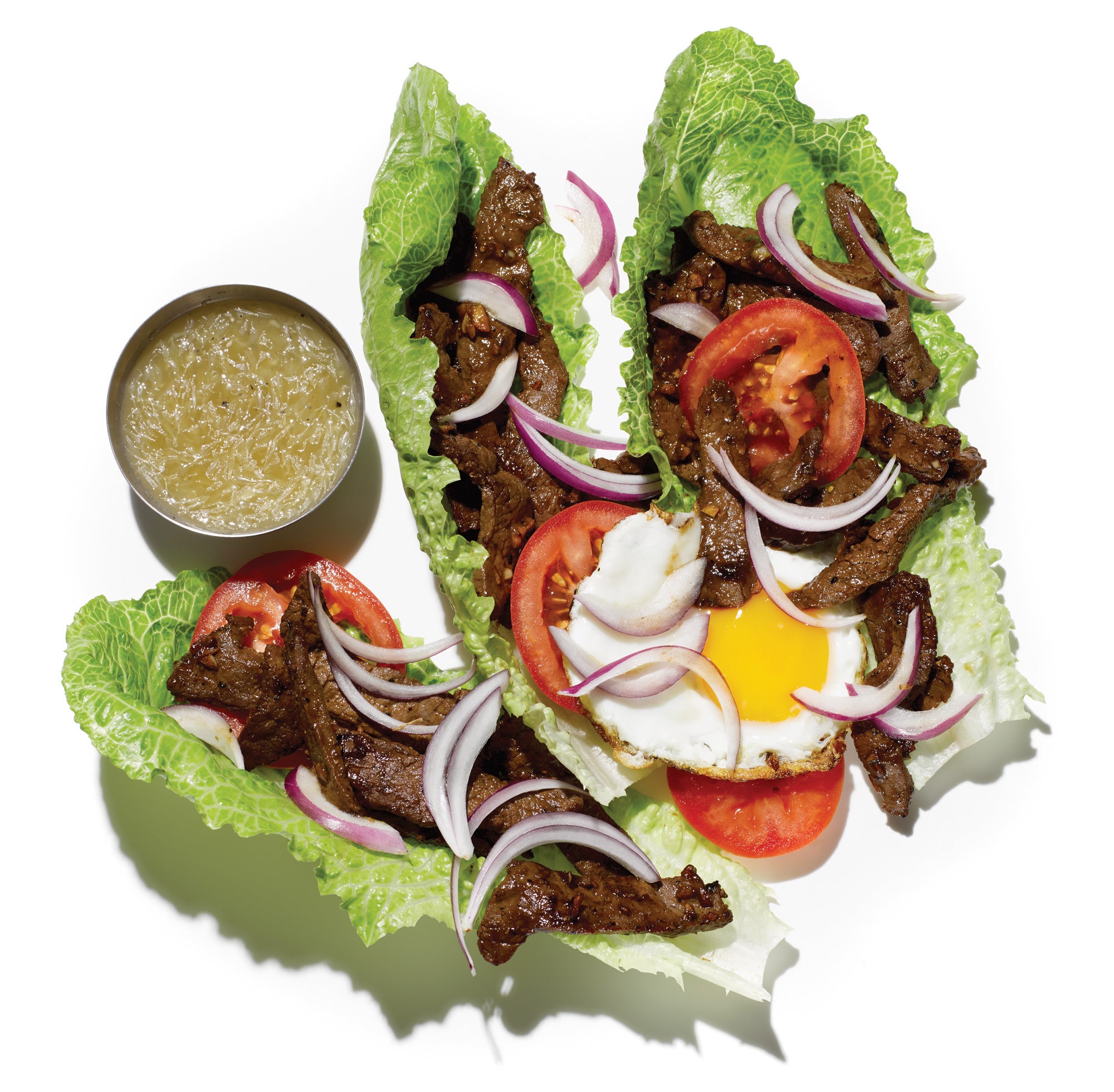 To serve, divide the meat between the plates. The best way to eat lok lak is to load up a lettuce leaf with the meat, some egg, tomato, and onion, and fold it into a wrap. Dip the wrap into the lime sauce and take a bite. Serves 4
