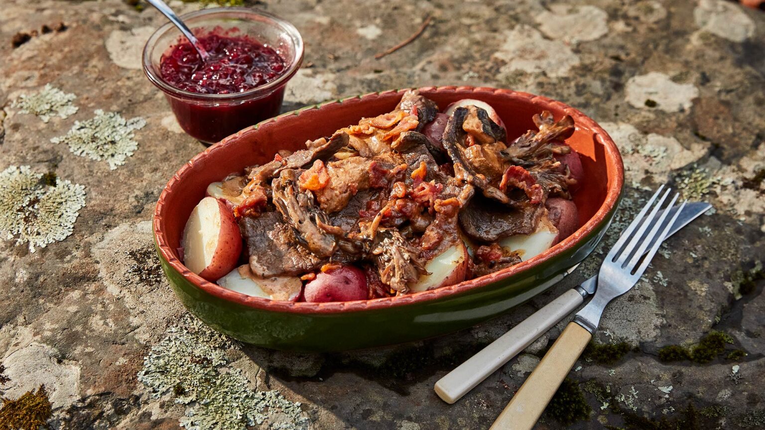 IN NORWAY, shaved reindeer meat melts into a creamy juniper-spiked mélange of bacon and wild mushrooms in an ancient dish called finnbiff. Our version uses venison from a deer but otherwise adheres to Norse tradition—including the use of brunost, a caramel-sweet whey cheese. Many large supermarkets stock it—look for the Ski Queen brand—but if you can’t find it, just substitute a spoonful of brown sugar. To slice your meat thinly enough, firm it up in the freezer for about half an hour first. (For bonus authenticity points, you can use a vegetable peeler to shave a hard-frozen roast.) Lingonberries are the Nordic cousin of cranberries, and the latter work fine; canned or jarred, look for whole berries, not the jellied version.