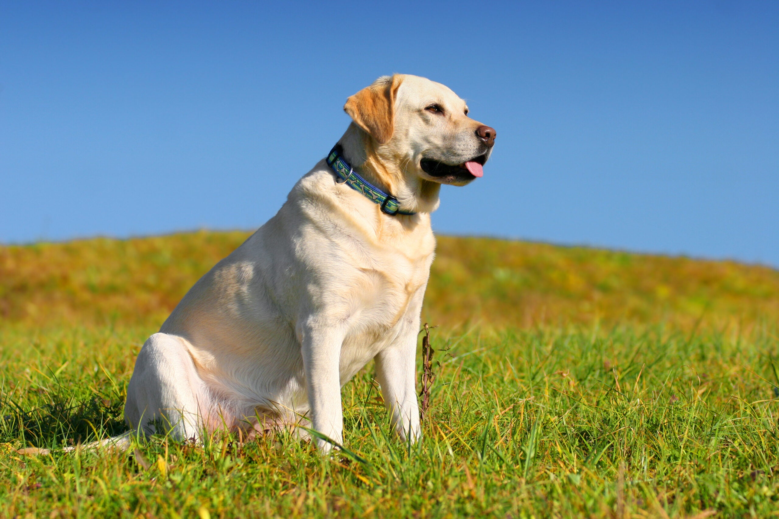 A tank of an English Lab takes a sit in the country. Tinka via Adobe Stock