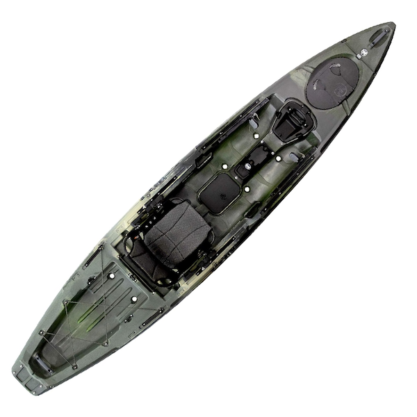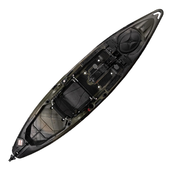 There’s a ton of storage on this boat, and the stability of the hull means you can access the giant bow hatch even while you’re on the water. The boat feels nimble, even at 34 inches wide, and is enjoyable to paddle long distances. The Flex Pod OS electronics console is handy to use, and can even be swapped out for a Helix MDTM Motor Drive if you get tired of paddling.