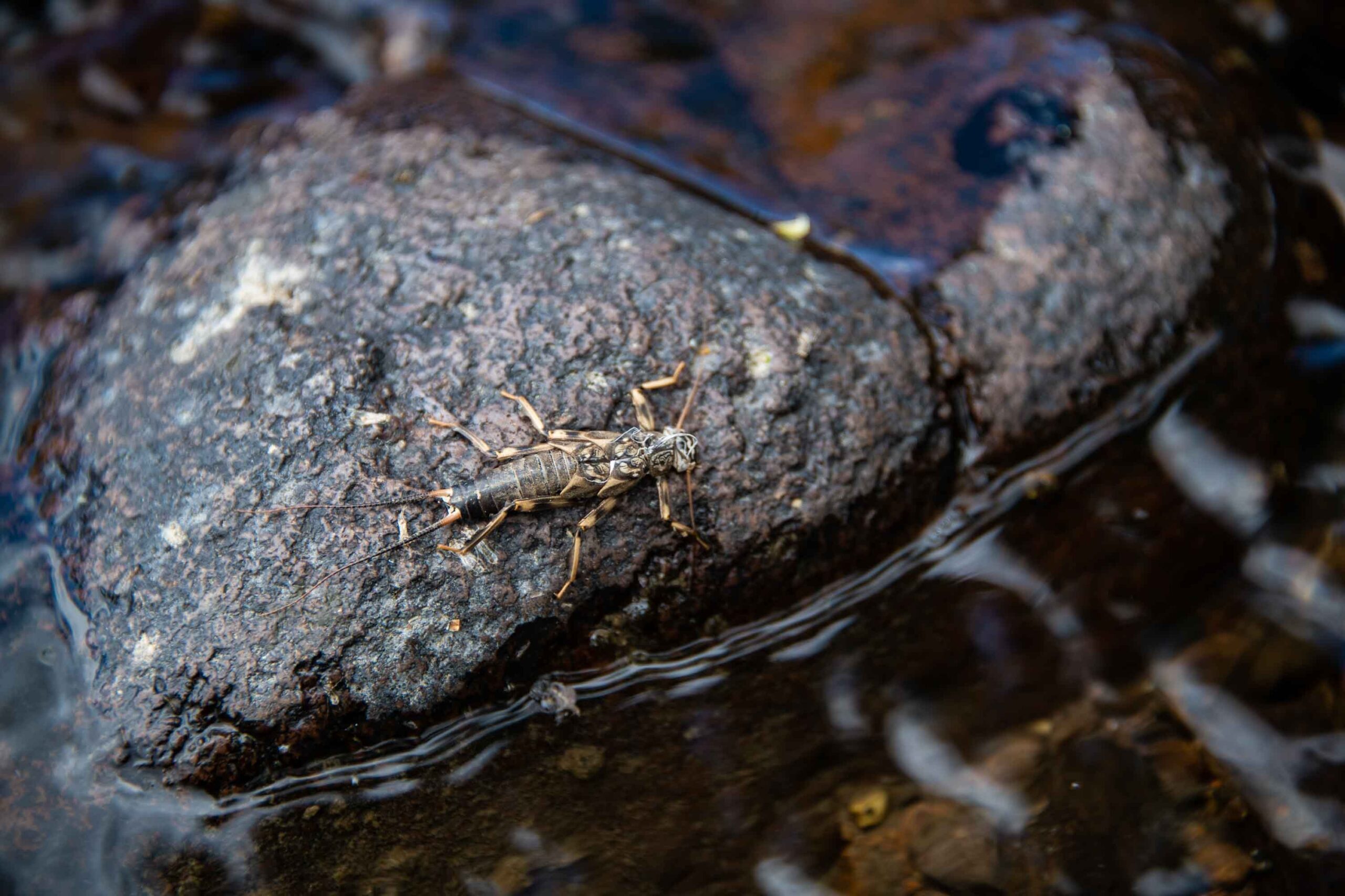 While some stonefly nymphs rise through the water column like mayflies, most crawl ashore, settling on streamside vegetation or rocks before shedding their exoskeleton and turning into winged adults. These adult flies are easily identified by their flat wing shape.