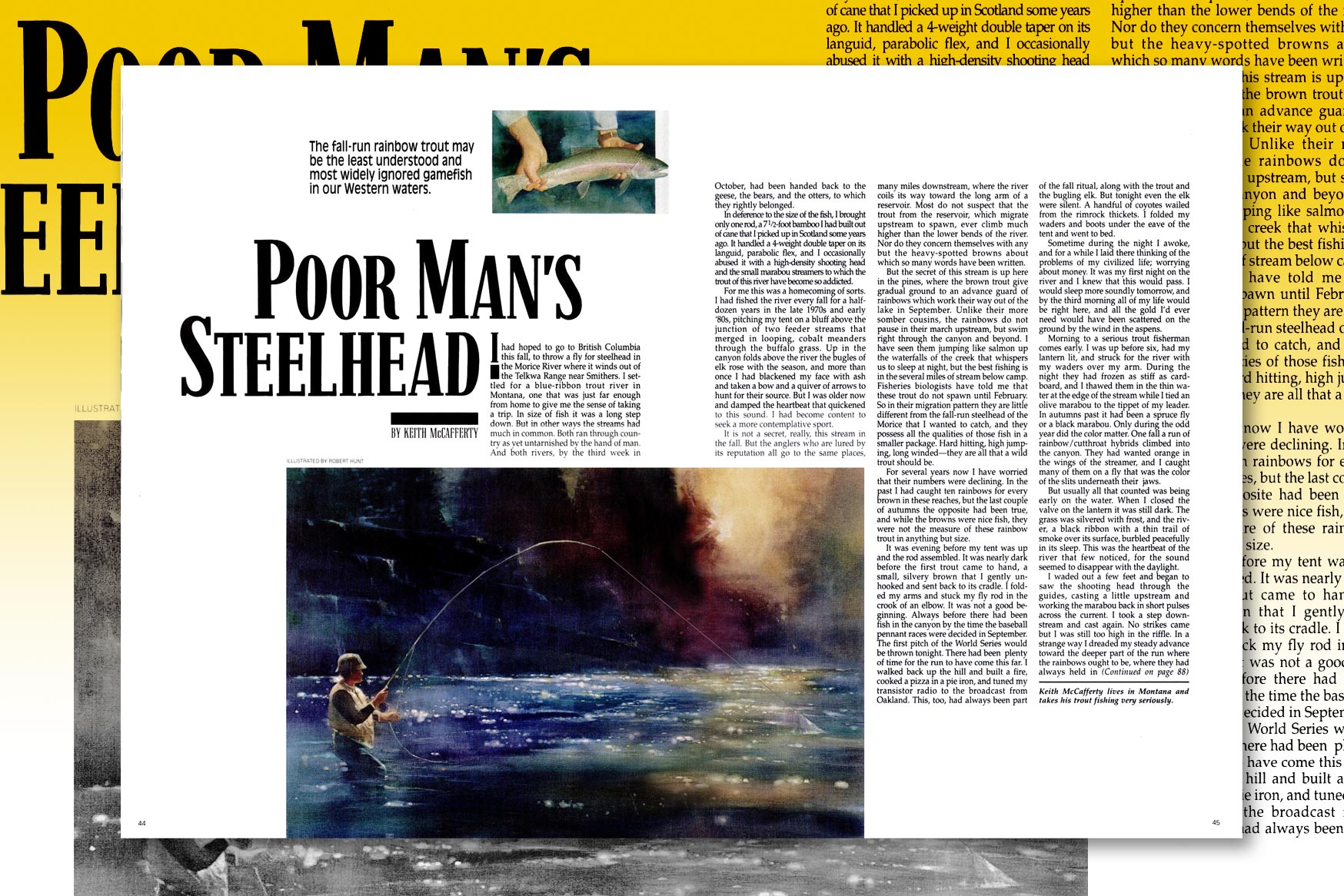 I HAD HOPED to go to British Columbia this fall, to throw a fly for steelhead in the Morice River where it winds out of the Telkwa Range near Smithers. I settled for a blue-ribbon trout river in Montana, one that was just far enough from home to give me the sense of taking a trip. In size of fish it was a long step down. But in other ways the streams had much in common. Both ran through country as yet untarnished by the hand of man. And both rivers, by the third week in October, had been handed back to the geese, the bears, and the otters, to which they rightly belonged.