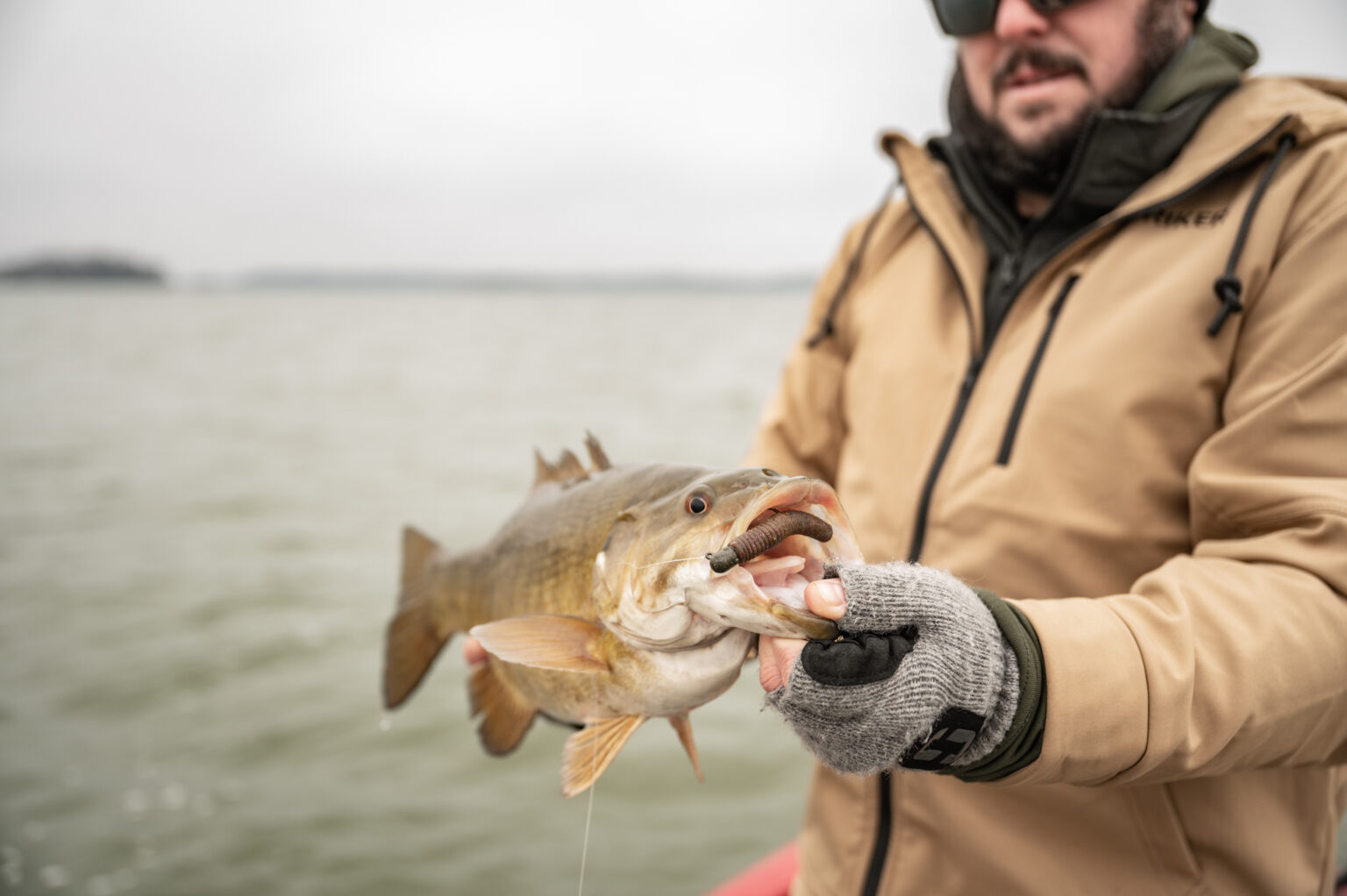 A 3-inch stick worm on a mushroom style jig head closely mimics gobies, darters, crawfish, and other basement dwelling forage. With can’t-screw-this-up simplicity, the rig works for dragging, hopping, or scooting presentations. Just know your habitat and choose an open hook or weedless configuration. The latter could be a weed guard design, or a Ned head with a wide gap hook made for Texas rigging. This rig works very well during the spawn when fish are on beds.