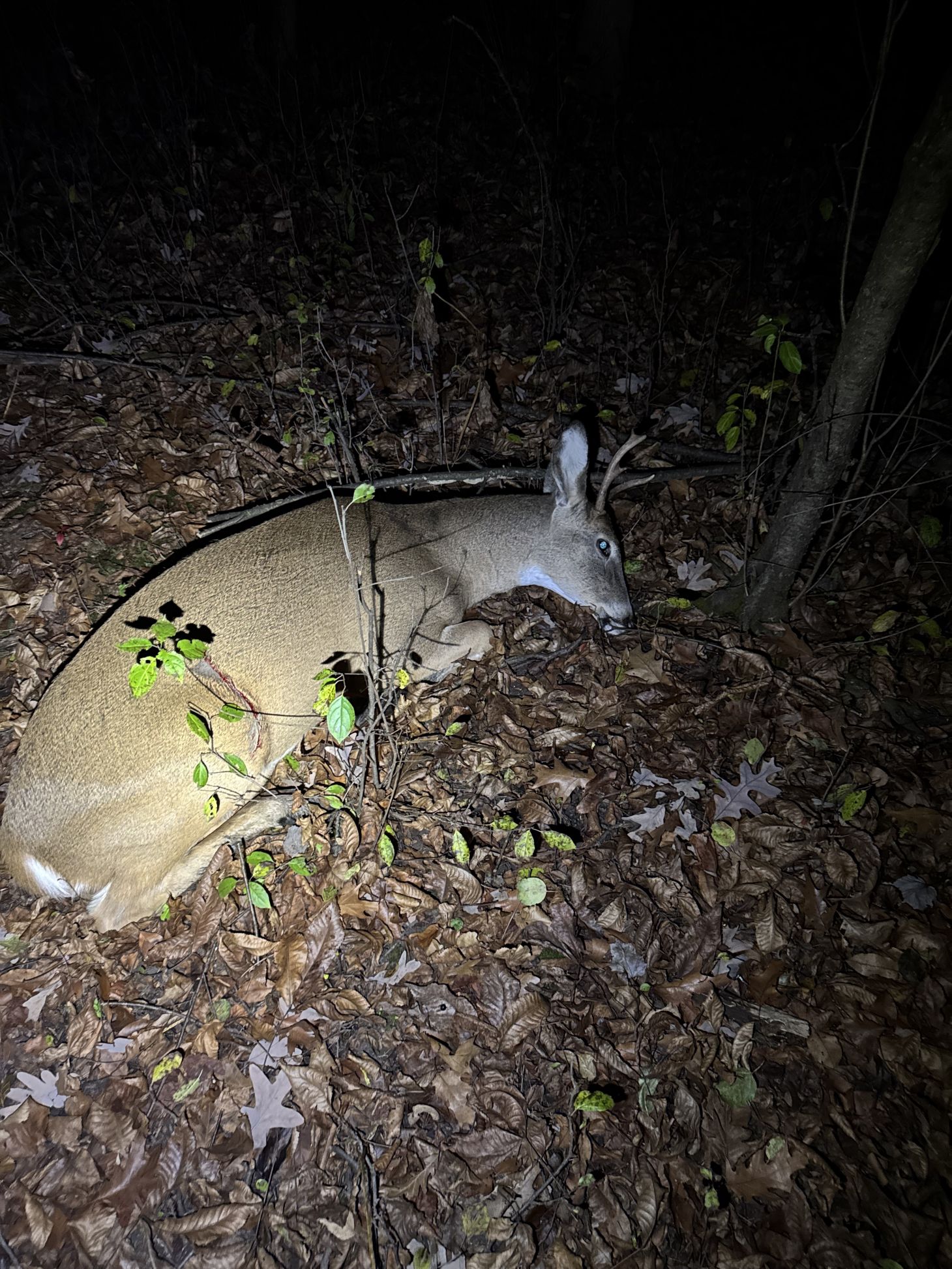 Then I caught the faint reflection of eyes at ground level. Fifteen yards beyond where the trail had gone cold, there he was. My deer.