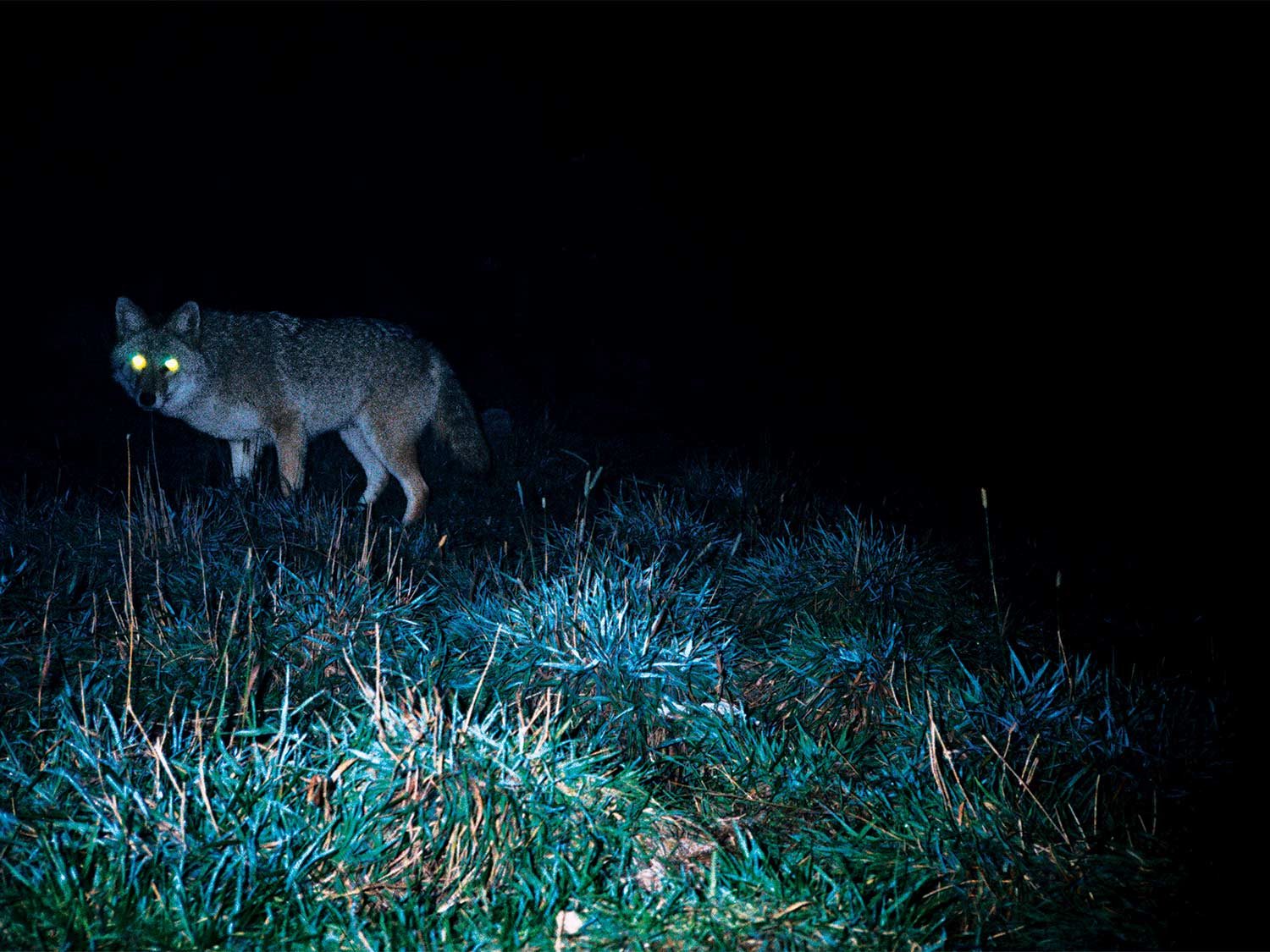 Calling up a predator is fun at any time of day, but I get an extra charge from doing it at night. A predator’s eyes glow in a spotlight, and a red-“‹filtered beam makes them look positively wicked. You can see those eyes from a couple hundred yards away with a good light, and you can keep tabs on them as the critter nears the call. Good night hunters learn to catch the animal’s eyes with the bottom edge of the beam—called the halo—and track them with that until they’re in range. Only hit the critter with the full beam when it’s time to shoot. Too much light too soon usually spooks them.