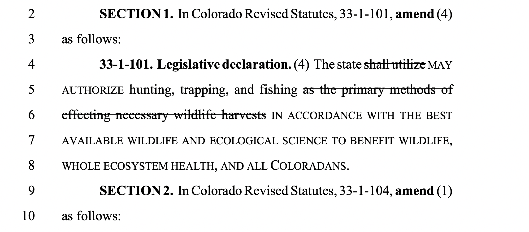 Velasco and Story's bill would have replaced the phrase "shall utilize hunting, trapping, and fishing" with "may authorize hunting, fishing, and trapping" in the legislative declaration that governs CPW. It also would have deleted a 9-word phrase in the declaration that ensures that hunting, fishing, and trapping are the "primary methods" by which CPW manages fish and game in the state.